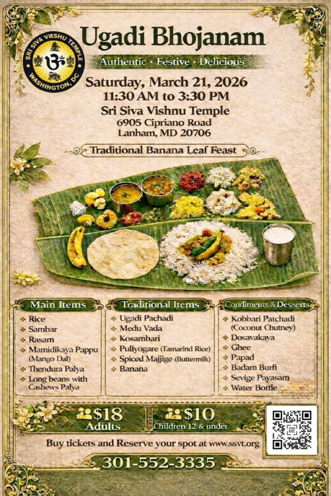As part of the festivities, the temple will host a special Ugadi Bhojanam from 11:30 AM to 3:30 PM, featuring an authentic traditional banana leaf meal lovingly prepared to bring the festive taste of India to the community. Devotees are kindly encouraged to register in advance using the button below to reserve their guaranteed seating, and to join the temple family in celebrating Ugadi with devotion, joy, and shared tradition.